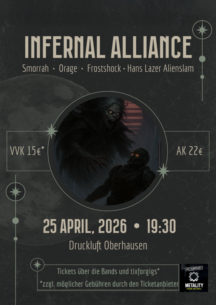 Wir starten in die Live-Saison mit einer richtigen Granate! Zusammen mit unseren Freunden von Smorrah, Frostshock und Hans Lazer Alienslam laden wir zur Infernal Alliance in das Druckluft in Oberhausen.